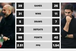 瓜迪奥拉vs阿尔特塔英超四月份执教成绩: